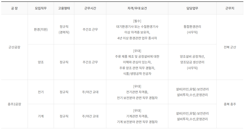 • 음료 및 주류 생산 설비 운용 및 관리: 생산 라인의 원활한 가동을 위한 설비 조작, 모니터링, 일상 점검